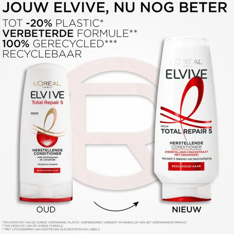L’Oréal Paris Elvive Total Repair 5 Herstellende Conditioner is speciaal ontwikkeld voor beschadigd haar. De formule bevat herstellend concentraat met ceramiden. Deze formule herstelt en versterkt het haar, maakt het makkelijker door te kammen, verzorgt en pakt de vijf tekenen van beschadigd haar aan: 1. Voelt als stro 2. Broos 3. Gedeydrateerd 4. Stijf 5. Gespleten punten. De Elseve Total Repair 5 Conditioner is verrijkt met ceramiden. Ceramide bootst van nature voorkomende ceramide lipiden na, voor een formule die reinigt en beschadigde haarvezels helpt te herstellen*, voor een regelmatig en glad oppervlak. Jouw Elvive, nu nog beter! Onze vernieuwde fles is gemaakt met tot -20% minder plastic** en is gemaakt van 100% gerecycled plastic***. Daarnaast is de fles ook recyclebaar. *Instrumentele test shampoo + conditioner. **Ten opzichte van de vorige verpakking. Plastic vermindering varieert afhankelijk van het verpakkingsformaat. ***Met uitzondering van de additieven, kleurstoffen en labels.