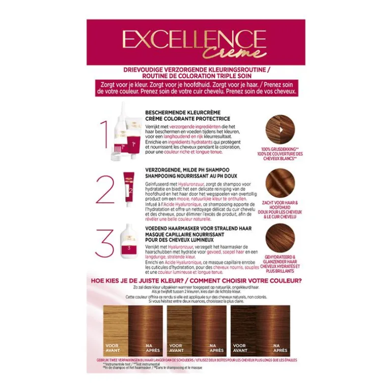 - Excellence Crème biedt een intensieve verzorging voor je haar tijdens het kleurproces, dankzij de drievoudig verzorgende formule die voeding, hydratatie en bescherming combineert.
