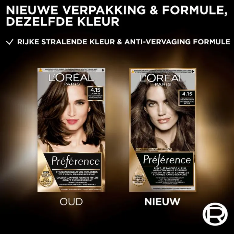 L’Oréal Paris Préférence is een permanente haarkleuring die tot 100% grijsdekking biedt. In de verpakking van Préférence vind je 5 componenten: de kleurgel, de ontwikkelcrème, de glansbeschermende conditioner en natuurlijk een paar handschoenen en de gebruiksaanwijzing. De kleurgel meng je met de ontwikkelcrème. De Préférence glansbeschermende conditioner kan na de kleurbehandeling meerdere malen gebruikt worden. De conditioner bevat een UV-filter om het gekleurde haar tegen de invloeden van de zon te beschermen en Vitamine E, ter ondersteuning van de haarkwaliteit. Bij wekelijks gebruik van de conditioner zal de glans in het haar langer behouden blijven.