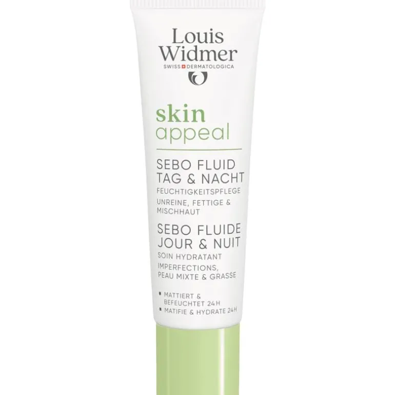 Louis Widmer skinappeal Sebo Fluide Dag & Nacht is een matterende dag- en nachtverzorging.