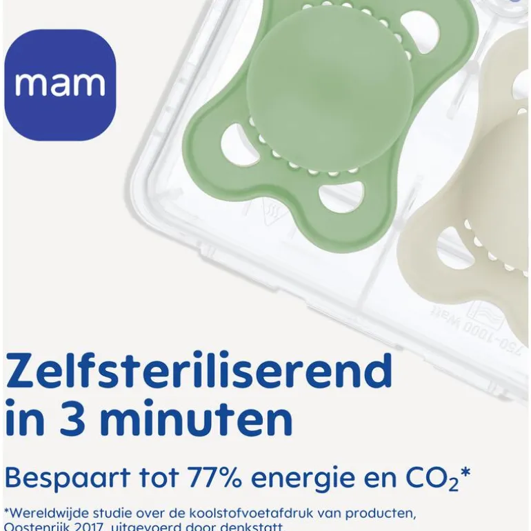 MAM fopspenen zijn ontwikkeld in samenwerking met tandartsen en hebben een orthodontische vorm voor een gezonde tand- en kaakontwikkeling. Dankzij het symmetrische speenschild ligt de speen altijd goed in de mond van de baby. De luchtgaten, het gebogen speenschild en de noppen aan de binnenkant van het schild zorgen dat de speen bijzonder zacht aanvoelt voor de gevoelige babyhuid. De speenknop is gemakkelijk vast te pakken door kleine babyhandjes. De MAM Original fopspeen is gemaakt van SkinSoft™ Silicone, waardoor de speen door 94% van de baby’s wordt geaccepteerd.² De fopspenen worden geleverd in een praktisch sterilisatie- en transportdoosje, waarin ze snel en zonder extra apparatuur in de magnetron gesteriliseerd kunnen worden. Dit zorgt voor een besparing van 77% CO₂, energie en water.³ De MAM Original is de eerste klimaatneutrale MAM fopspeen. Het schild en de knop zijn gemaakt van duurzaam, bio-circulair materiaal om de CO₂-voetafdruk zo klein mogelijk te houden. De resterende CO₂ wordt door MAM gecompenseerd in samenwerking met Climate Partner.¹ De MAM Original fopspeen voldoet aan de EN1400 norm en is BPA- en BPS-vrij.