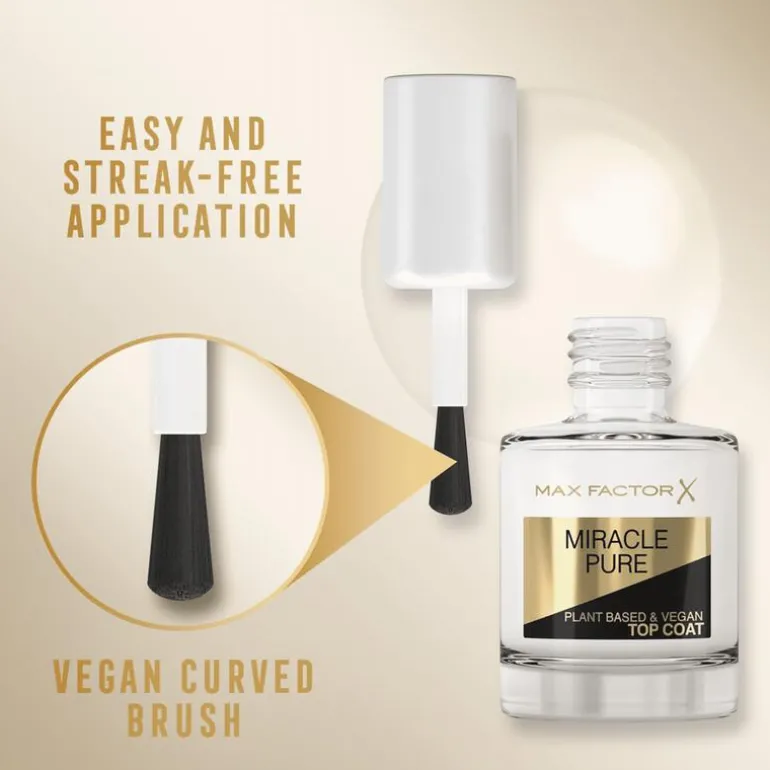 Verzorgend tijdens het dragen…Max Factor introduceert Miracle Pure Nagellak – onze eerste 100% vegan nagellak mede mogelijk gemaakt door plantaardige ingrediënten; Met rijke kleuren en een hoge glans die lang aanhoudt.