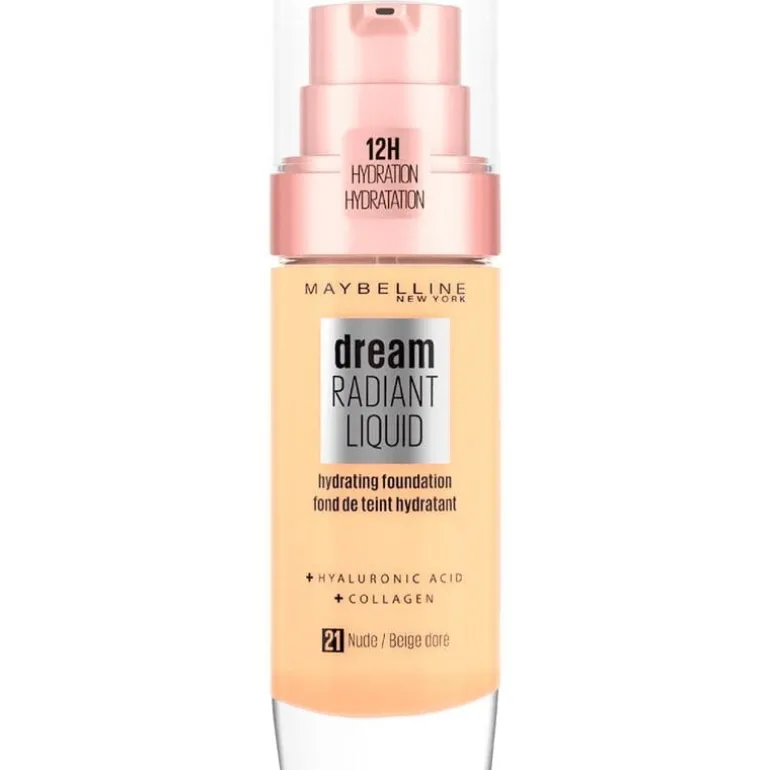 Maybelline New York Dream Radiant Liquid 21 Nude Beige is een foundation met verzorgend collageen en hyaluronzuur voor een egaal uitziende teint Voor een stralende huid + tot 12H hydratatie.