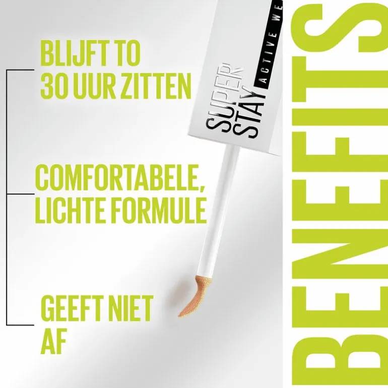 SuperStay Active Wear 30H Concealer, eerst bekend als SuperStay Under Eye Concealer, heeft onze hoogste dekking voor een super egale uitstraling van de huid die dag en nacht blijft zitten – tot 30 uur*. De langhoudende concealer bedekt donkere kringen en wallen tot 30 uur lang voor een wakkere blik. De Maybelline concealer vervaagt niet, gaat niet in de lijntjes van je gezicht zitten én is waterproof voor een flawless finish wat het weer je ook brengt. De vegan** formule is super gepigmenteerd waardoor de dekking van de Maybelline concealer heel hoog. Door de lichte textuur ademt de formule nog wel en voelt comfortabel aan. Zo worden donkere kringen en wallen in één applicatie bedekt voor frisse uitstraling terwijl jij je comfortabel voelt.