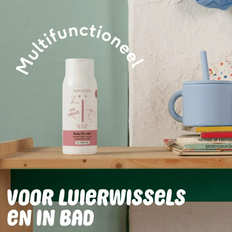 Ontwikkeld en geproduceerd in Nederland. De gevoelige babyhuid verdient alleen het allerbeste. Daarom is Naïf Babypoeder gemaakt van 100% natuurlijke rijstzetmeel, zonder talk. Het absorbeert vocht op milde wijze en helpt huidirritatie te voorkomen, zonder de poriën te verstoppen. Zonder toegevoegd parfum en geschikt voor de gevoelige huid, dus perfect voor de huidplooien en de gevoelige huid in het luiergebied. Een klein beetje in bad kan ook bijdragen aan een kalmerend en verzorgend moment voor de gevoelige babyhuid.