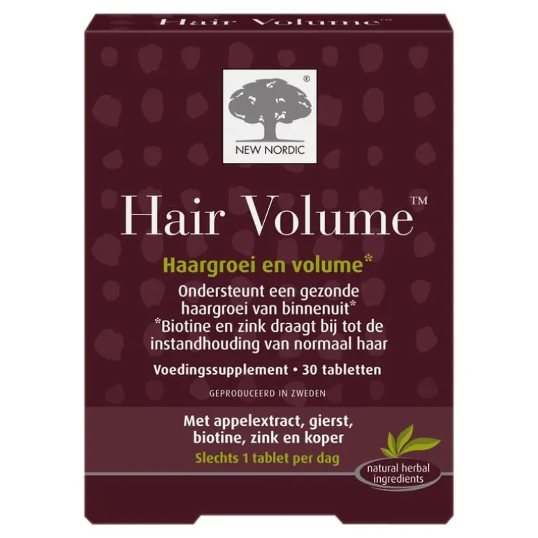 Mooi, gezond en vol haar? New Nordic Hair Volume tabletten ondersteunen het behoud van gezond haar. De haargroeitabletten bevatten biotine en zink dat voedingsstoffen naar de hoofdhuid en haarfollikels brengt en zo bijdraagt aan het behoud van sterk haar. New Nordic Hair Volume tabletten bevatten bovendien appelextract, wat rijk is aan procyanidine B2, gierst en koper*. Deze voedingsstoffen staan bekend om hun vermogen het haar van binnenuit sterk te houden. De tabletten zijn vrij van gluten, lactose en soja. De verpakking van New Nordic Hair Volume is 100% recyclebaar.