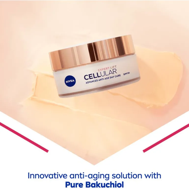 Verzorg je huid intensief met NIVEA CELLular Expert Lift Anti-Age Dagcrème. Deze dagcrème bevat krachtige anti-age ingrediënten die diep in de cellen werken. Dat zorgt voor een jonger uitziende huid die de werking van je cellen perfect weerspiegelt. Tegelijkertijd voelt je huid zacht en soepel aan, terwijl diepe rimpels zichtbaar verminderd worden. De anti-age crème is verrijkt met SPF 30 wat optimaal beschermt tegen uv A- en uv B-straling. NIVEA CELLular Expert Lift Anti-Age Dagcrème bevat bakuchiol, vergelijkbaar met retinol maar krachtiger. Het stimuleert de collageenaanmaak, vermindert rimpels en maakt de huid gladder en steviger. Bakuchiol beschermt beter tegen vrije radicalen dan retinol en is goed verdraagbaar voor alle huidtypen, inclusief de gevoelige huid. De crème bevat ook macro en micro hyaluronzuur die de huid hydrateren en rimpels verminderen door tot 1000 keer hun gewicht in water vast te houden. • Vermindert rimpels van binnenuit • Stimuleert de werking van de cellen • Verbetert de contouren van het gezicht • Met bakuchiol en twee soorten hyaluronzuur • Geschikt voor alle huidtypen • Bevat een SPF30 UVA/UVB