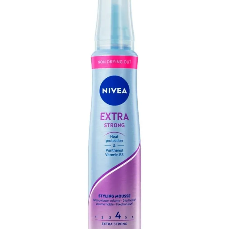 NIVEA Extra Strong Styling Mousse biedt je haar extra sterke controle en tot 24 uur flexibele houdbaarheid, zonder dat het zwaar aanvoelt of plakkerig wordt. Deze formule verrijkt met Panthenol en Vitamine B3, verzorgt en versterkt je haar, terwijl het beschermd blijft tegen hittebeschadiging door stylingapparaten. De mousse droogt het haar niet uit en geeft een prettig gevoel, perfect voor wie een betrouwbare stylingoplossing zoekt die het haar gezond en natuurlijk laat aanvoelen. Ideaal voor dagelijks gebruik, geeft NIVEA Extra Strong Styling Mousse je haar langdurige fixatie en natuurlijke beweging. Voor wie houdt van flexibiliteit en verzorging in één product, is deze mousse de ideale keuze om je stijl de hele dag in model te houden zonder concessies aan comfort of verzorging.
