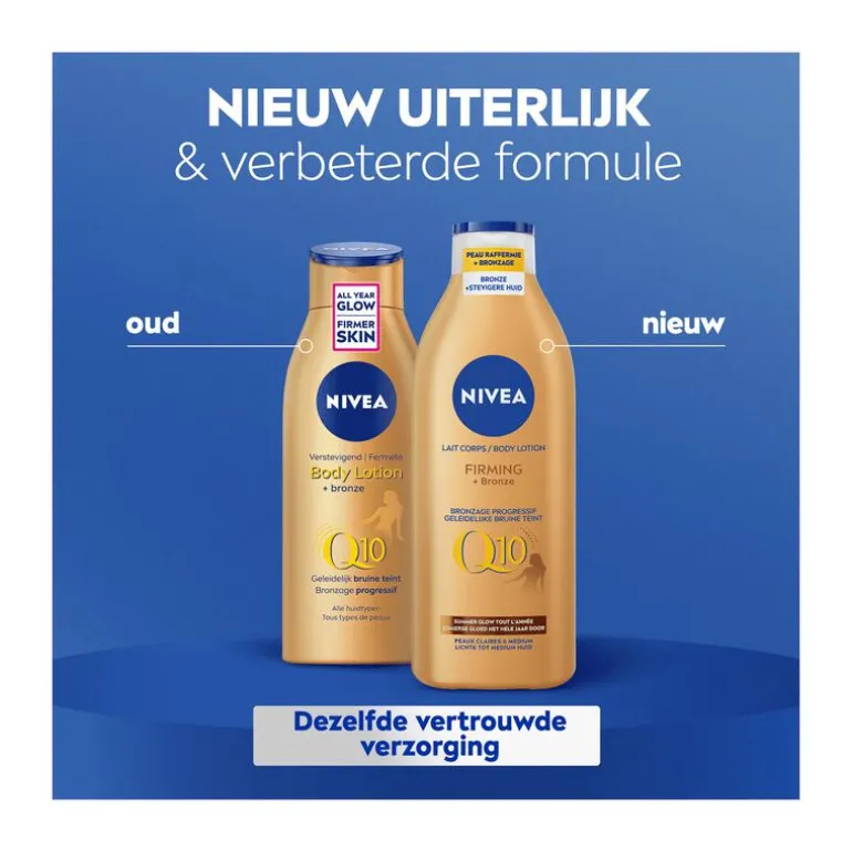 Wil je stralen als de zomerzon met een mooiere huid? Omarm en benadruk je zomerse gloed. NIVEA Q10 Firming + Bronze Body Lotion heeft een verstevigende formule met Q10 die de elasticiteit van de huid in slechts 10 dagen verbetert. De bodymilk bouwt een natuurlijk gebruinde look op en komt bovendien de conditie van je huid ten goede. Laat het hydrateren maar aan deze bodylotion over.