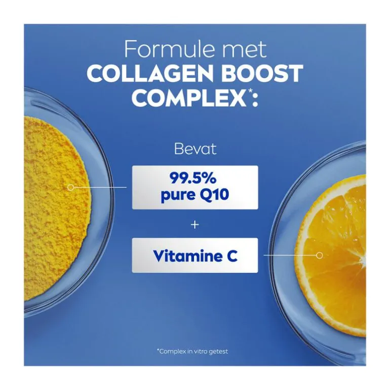 Wil je een zichtbaar stevigere en elastischere huid? De Collagen Boost Complex** formule met 99,5% pure Q10 en vitamine C verstevigt de huid zichtbaar en verbetert de elasticiteit van de huid vanaf 10 dagen.*