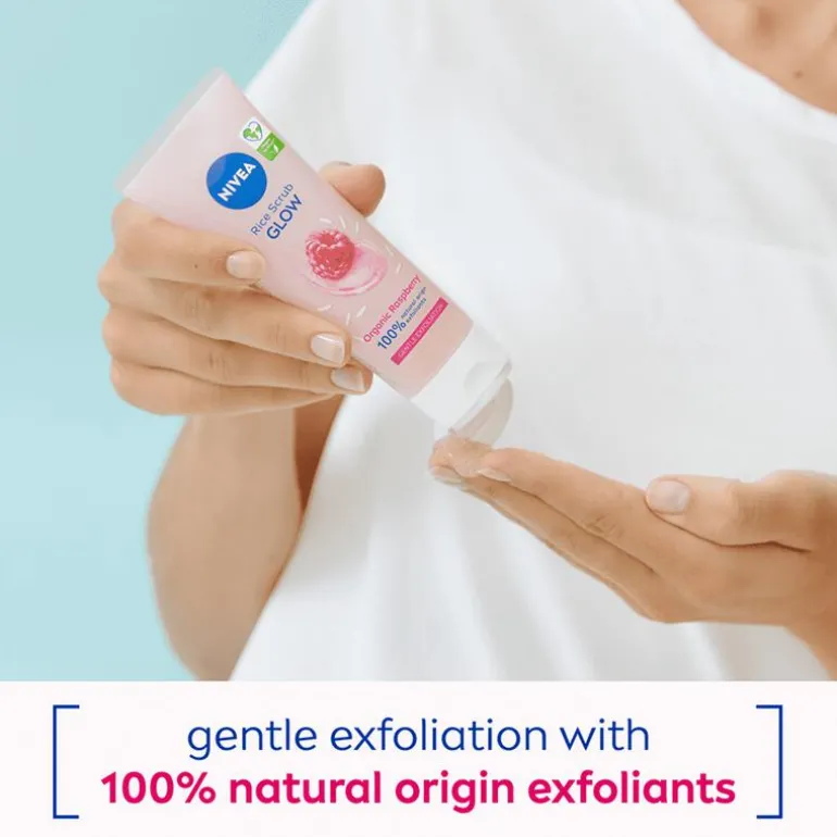 NIVEA Glow Rijstscrub is een diep reinigende en voedende scrub die je natuurlijke huidvernieuwing ondersteunt. Gebruik deze scrub om dagelijks je huid te reinigen. Dankzij de milde formule voor de gevoelige en droge huid kun je je huid exfoliëren zonder deze te irriteren. De NIVEA scrub verwijdert dode huidcellen, reinigt de huid en verfijnt je teint. Zo geniet je van een natuurlijke glow en een heerlijk zacht huidgevoel. Maak simpelweg de huid nat en masseer de rijstscrub in de huid.Deze gezichtsscrub onderscheidt zich door de verzorgende bestanddelen die het mild en effectief maken. De kostbare Japonica-rijstzaden worden verbrijzeld en gezeefd, en gemengd met biologisch frambozensap voor een frisse scrub met verzorgende kwaliteiten. De rijst fungeert als antioxidant, terwijl de vitaminen in het frambozensap kalmerend, verzachtend en hydraterend werken. De subtiele scrubdeeltjes verwijderen dode huidcellen, waardoor je een egale teint krijgt. • Reinigt mild en verwijdert dode huidcellen zonder de huid te irriteren• Verrijkt met Japonica-rijstzaden en framboos• Stimuleert de huidvernieuwing• Verfijnt en versterkt het huidoppervlak, voor een frisse huid• Verzacht de huid