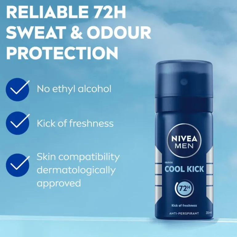 NIVEA MEN Cool Kick Quick Dry Anti-Transpirant Spray geeft je een krachtige kick van frisheid dankzij de unieke Cool-Care-formule. Deze mannen deo spray biedt 72 uur lang betrouwbare bescherming tegen zweet en geur, terwijl de huidvriendelijke formule mild is voor je huid en geen alcohol bevat.Met de innovatieve Derma 72u Active Protection technologie werkt deze anti-transpirant voor mannen samen met je huid om maximale effectiviteit te bieden, zelfs tijdens drukke of actieve dagen. Dermatologisch getest en speciaal ontwikkeld voor mannen die frisse, langdurige bescherming willen zonder compromissen.Kies voor NIVEA MEN Cool Kick Quick Dry en ervaar een deodorant spray die frisheid en kracht combineert met ultiem comfort. Perfect voor elke dag en elke situatie.