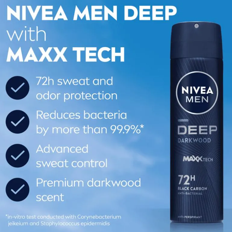 NIVEA MEN DEEP Darkwood Black Carbon Anti-Transpirant is speciaal ontwikkeld voor mannen die op zoek zijn naar een krachtige en betrouwbare bescherming tegen transpiratie. Deze deodorant biedt maar liefst 72 uur lang effectieve anti-transpirantbescherming, waardoor je de hele dag verzekerd bent van een fris en zelfverzekerd gevoel. De unieke formule is verrijkt met zwart koolstof, wat niet alleen zorgt voor een krachtige bescherming tegen bacteriën, maar ook een langdurige, mannelijke geur van donkere houtsoorten biedt.Deze deodorant voor mannen is ontworpen om geen zichtbare zwarte resten achter te laten, zodat je huid droog en schoon aanvoelt zonder ongewenste sporen op je kleding. Of je nu een drukke werkdag hebt, intensief sport of ontspant tijdens je vrije tijd, NIVEA MEN DEEP zorgt ervoor dat je altijd fris en verzorgd blijft. Bovendien is de huidverdraagzaamheid dermatologisch bewezen, zodat je deze deo met een gerust hart dagelijks kunt gebruiken. Kies voor NIVEA MEN DEEP Darkwood Black Carbon Anti-Transpirant en ervaar krachtige bescherming, langdurige frisheid en ultiem comfort in één.