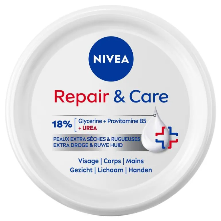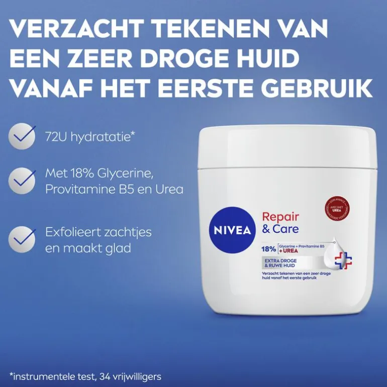 Voelt je huid zeer droog en ruw aan en heeft het extra verzorging nodig? Probeer dan de NIVEA Repair & Care Urea Crème. De zachte maar krachtige formule met 18% glycerine, Provitamine B5 en Urea hydrateert de huid intensief en voedt de huid gedurende 72 uur*. De formule verlicht tekenen van een zeer droge en ruwe huid en laat de huid vanaf het eerste gebruik zacht aanvoelen. De voedende crème voorkomt vochtverlies en hydrateert de huid intensief.