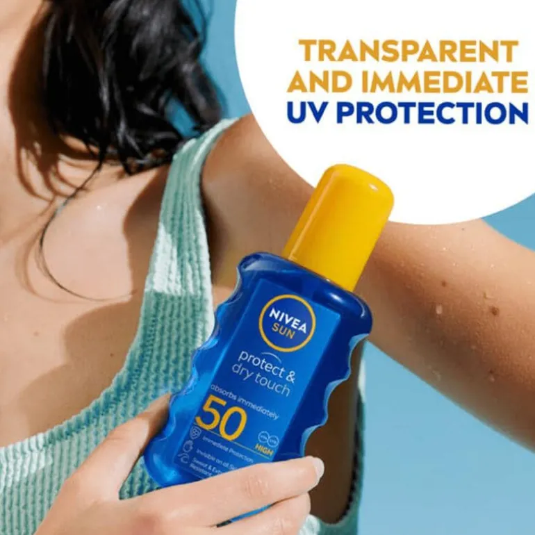 Met NIVEA SUN Protect & Dry Touch Transparante Zonnespray bied je je huid de beste bescherming tegen de zon, zonder een vet laagje op de huid achter te laten. Deze zonnebrand spray heeft SPF 50 en beschermt je daardoor effectief en onmiddellijk tegen uv A/uv B. Doordat je de zonnecrème makkelijk over de huid vernevelt met de spraykop is het eenvoudig om jezelf gelijkmatig in te smeren. Je gebruikt hem zelfs op de kop, ideaal voor lastig bereikbare plekken. De formule van deze transparante zonnebrand spray trekt bijzonder snel in. Geniet van een verkoelend effect en laat de huid zijdezacht aanvoelen met deze krachtige waterdichte zonnespray. De formule van NIVEA SUN Protect & Dry Touch Transparante Zonnespray is met zorg samengesteld, niet alleen voor je huid, maar ook voor de oceaan. Zo bevat NIVEA SUN Protect & Dry Touch 50 geen octinoxate en oxybenzone*. De huidvriendelijkheid is dermatologisch goedgekeurd. *in 2018 goedgekeurd om koralen te beschermen.