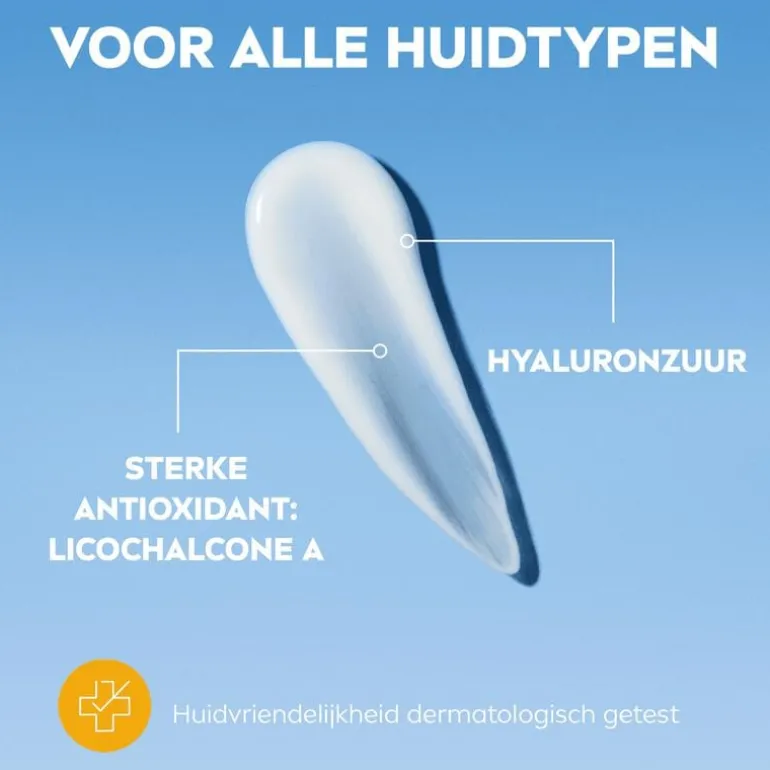 Met Hyaluronzuur & Licochalcone A. Hyaluronzuur hydrateert de huid terwijl Licochalcone A het huideigen afweermechanisme activeert
