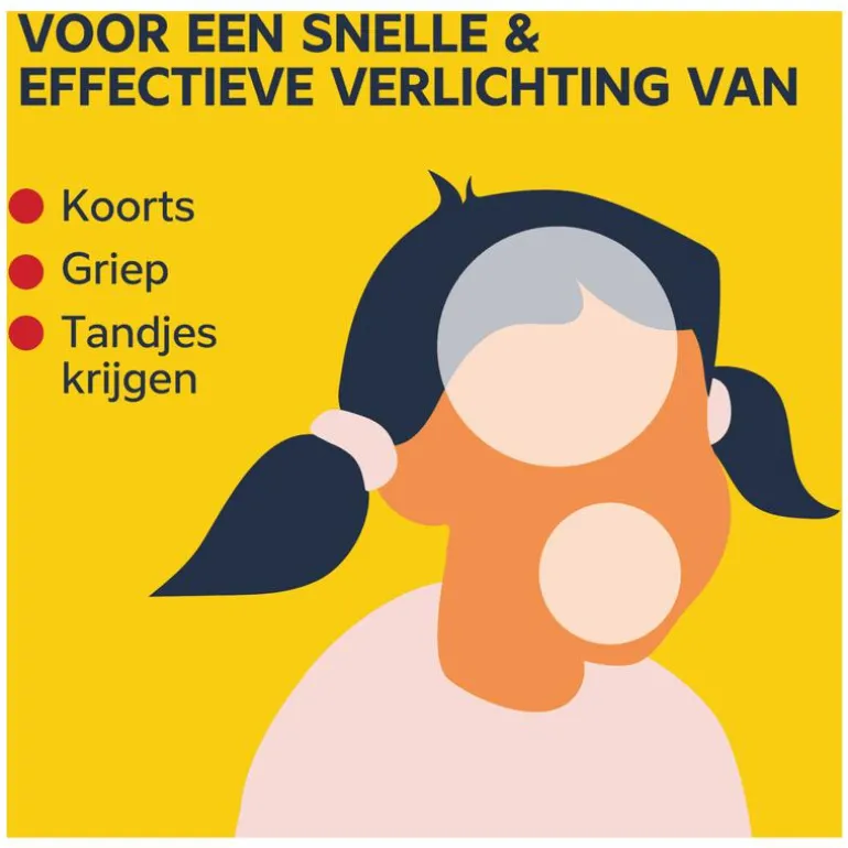 Niet gebruiken bij allergie voor één van de stoffen in dit geneesmiddel. Niet geschikt voor kinderen jonger dan 6 jaar of lichter dan 20 kilogram. Als het kind overgevoelig is voor ibuprofen of vergelijkbare pijnstillers (NSAID’s) of het heeft na gebruik van acetylsalicylzuur (aspirine) of soortgelijke pijnstillers (NSAID’s) een astma aanval, kortademigheid, loopneus, zwelling gezicht en/of handen of netelroos gehad. Als het kind lijdt aan een maagdarmbloeding of -perforatie na eerder gebruik NSAID’s of last heeft van terugkerende maag- of twaalfvingerige darmzweer, hartfalen, lever- of nierfalen, hersenbloeding of andere actieve bloeding, bloedingsstoornissen of stoornis in de bloedaanmaak, ernstige uitdroging of erfelijke problemen bij het verwerken van fruitsuikers.,Indicatie: Voor een kortstondige behandeling van de symptomen koorts en lichte tot matige pijn.