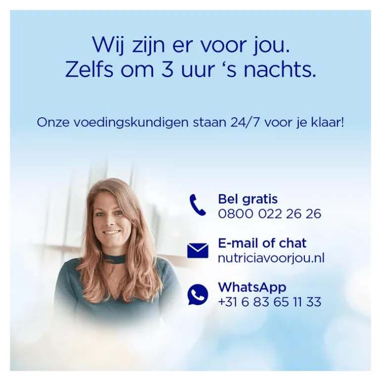 Heb je vragen over de voeding van je kindje? Onze voedingskundigen staan 24/7 voor je klaar. Bel de Nutricia kindervoeding service op: 0800 022 26 26 of whatsapp naar: 06-8365113