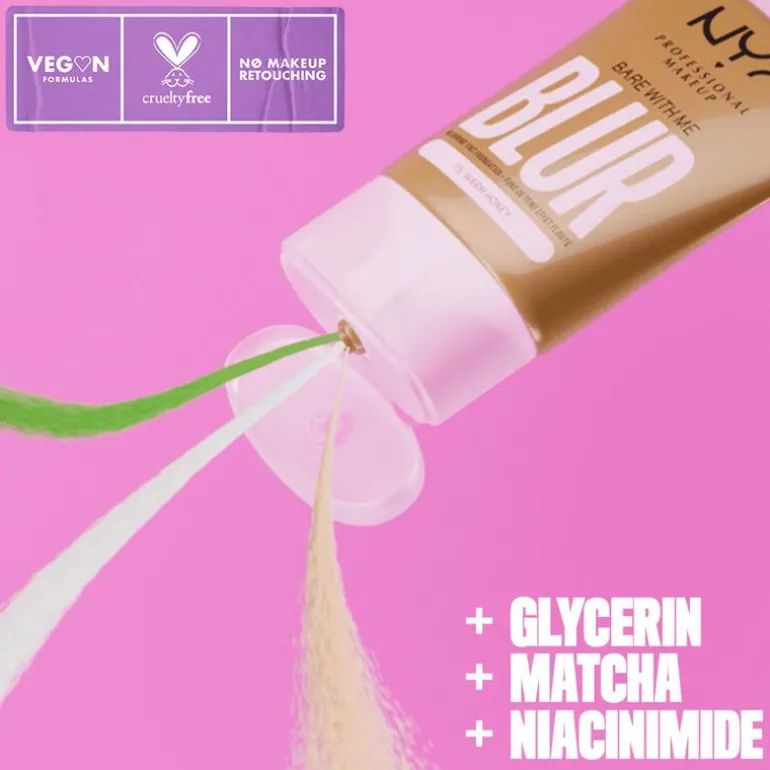 Ontdek de eerste NYX Professional Makeup foundation met blur-effect, Bare With Me Blur. Een medium- en flexibele dekking en een matte finish, verkrijgbaar in 24 tinten, die je huid laat stralen. Formule op basis van glycerine, matcha en niacinamide. De textuur glijdt over de huid en laat een wazige finish achter. Vegan* formule. *Geen ingrediënten of derivaten van dierlijke oorsprong.