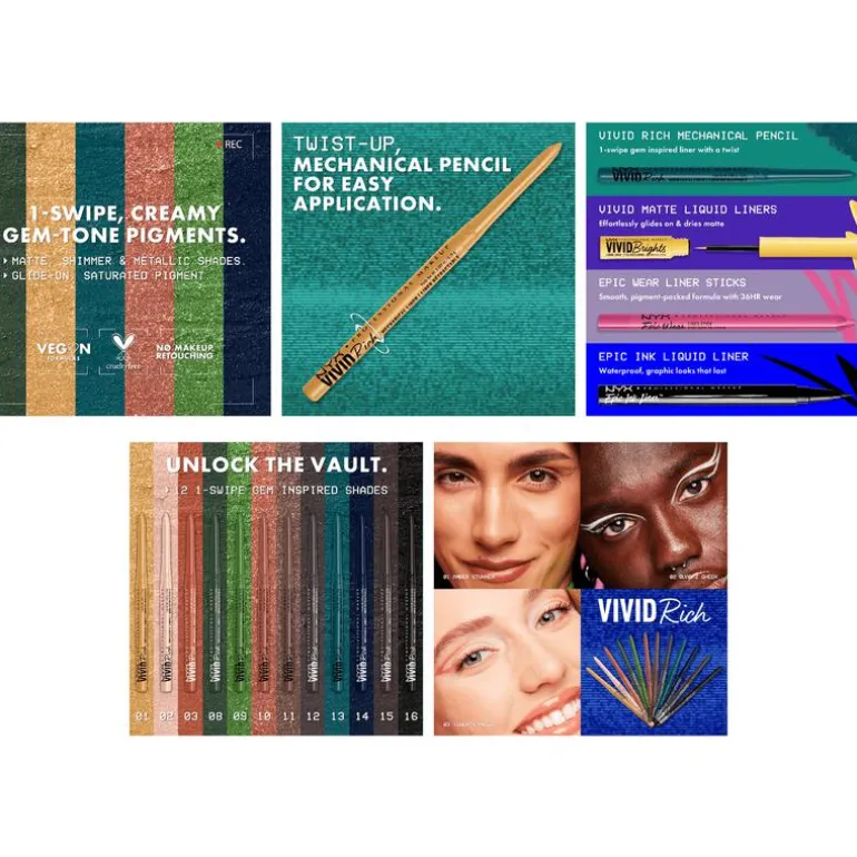 Nyx Professional Makeup Vivid Rich Mechanical Pencil biedt prachtige matte, glinsterende en metallic op edelstenen geinspireerde kleuren. De 12 tinten zijn rijk aan roomzachte, edelsteenkleurige pigmenten en zijn dankzij het twist-up potlood gemakkelijk aan te brengen in één beweging. Mix en match verschillende stralende tinten of kies voor een monochrome uitstraling. Van Spicy Pearl & Amber Stunner tot Aquamarine Dream: met deze levendige eyeliner creëer je de kleurrijkste looks. Toon je van je creatiefste kant en gebruik onze mooie levendige liners om indrukwekkende looks te creëren. Ideaal voor zowel beginners als echte pro’s en voor alle huidtypes! Mat, glanzend en metallic oogpotlood Stap 1. Breng Nyx Professional Makeup Vivid Rich Mechanical Pencil aan langs je bovenste wimperlijn om een gemakkelijke oogmake-uplook te creëren.Stap 2. Gebruik de fijne borstelpunt van de Vivid Matte vloeibare liner om in een handomdraai een perfecte wing of grafische lijnen aan te brengen.Stap 3. Creëer met de Epic Wear Liner stick kleurrijke looks voor een waterproof, smugde-proof en fade-proof resultaat.Stap 4. Teken moeiteloos vloeibare zwarte lijntjes of een vlijmscherpe wing met de Epic Ink Liquid liner. Nyx Professional Makeup Vivid Rich Mechanical Pencil biedt prachtige matte, glinsterende en metallic op edelstenen geinspireerde kleuren. De 12 tinten zijn rijk aan roomzachte, edelsteenkleurige pigmenten en zijn dankzij het twist-up potlood moeiteloos aan te brengen in één beweging. Mix en match verschillende stralende tinten of kies voor een monochrome uitstraling. Van Spicy Pearl & Amber Stunner tot Aquamarine Dream: met deze levendige eyeliner creëer je de kleurrijkste looks. Toon je van je creatiefste kant en gebruik onze mooie levendige liners om indrukwekkende looks te creëren. Ideaal voor zowel beginners als echte pro’s en voor alle huidtypes!Linerlooks worden gemakkelijk met NYX Vivid Rich. Kies je kleur en breng de kleurrijke eyeliner aan langs je bovenste wimperlijn om een gemakkelijke oogmake-uplook te creëren. Of experimenteer met vloeiende lijnen en wings.De NYX Vivid Rich Eyeliner is verkrijgbaar in de kleuren Always Onyx, Sapphire Bling, Truffle Diamond, Amber Stunner, Aquamarine Dream, Emerald Empire, Tigers Prize, Quartz Queen, Spicy Pearl, Smokin Topaz, Under the Moonstone en It’s Giving Jade. Creëer dus makkelijk elke look die je maar kunt bedenken!NYX Professional staat bekend om haar kwalitatieve, pigmentrijke make-upproducten en weerspiegelt de nieuwste make-up trends. In het portfolio van NYX vind je alles, van lippenstiften en oogschaduw tot eyeliners en concealers. Zowel populair bij het grote publiek, als bij professionele visagisten over de hele wereld!