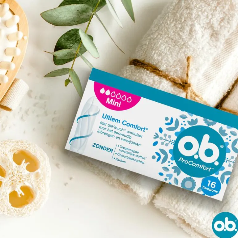 o.b.® ProComfort® Mini tampons met Dynamic Fit™ -technologie en SilkTouch®-oppervlak zorgen voor ultiem comfort* en betrouwbare bescherming voor de lichte tot normale dagen van uw menstruatie (* binnen het o.b.®-assortiment). De Dynamic Fit-technologie met 3D-expansie zorgt ervoor dat de tampon zich op een natuurlijke wijze naar het lichaam vormt en de unieke in elkaar overlopende groeven helpen de vloeistof naar de kern van de tampon te leiden. Met SilkTouch oppervlak voor probleemloos inbrengen en verwijderen. De tampons zijn gynaecologisch getest, hebben een kern die 100% plantaardig is, zonder schadelijke chemische stoffen (o.a. pesticiden). o.b.® ProComfort® Mini tampons zijn chloor- en parfumvrij.
