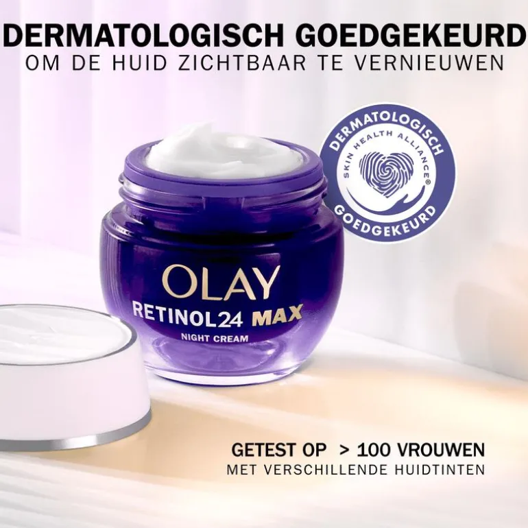 Deze parfumvrije nachtcrème heeft een zijdezachte textuur die niet vettig aanvoelt en snel absorbeert. Dermatologisch goedgekeurd om de huid zichtbaar te vernieuwen. Ervaar de vernieuwende kracht van Olay Retinol 24 MAX. *t.o.v. Retinol24 nachtcrème.