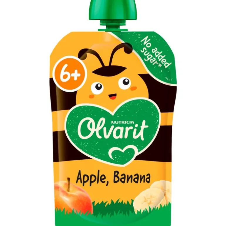 Olvarit Knijpfruit Appel Banaan, geschikt voor baby’s vanaf 6 maanden oud.