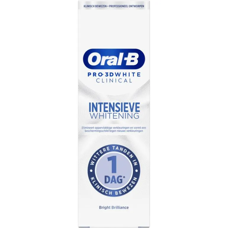 Oral-B Pro-3D White Clinical Intensive Whitening tandpasta zorgt klinisch bewezen voor wittere tanden vanaf de eerste dag door het verwijderen van oppervlakkige verkleuringen. Het is met zijn unieke ionische technologie de beste whitening-tandpasta van Oral-B: Het maakt verkleuringen los zonder te schrobben, verwijdert ze door middel van ionische whitening-technologie en beschermt tegen toekomstige verkleuringen – zelfs bij gevoelige tanden.
