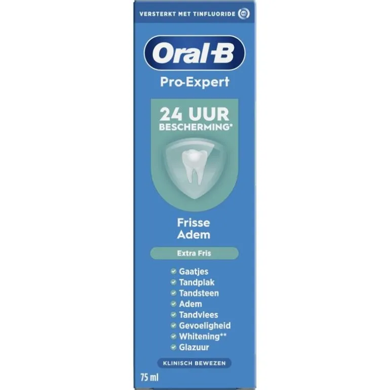 De Oral-B Pro-Expert Frisse Adem tandpasta is klinisch bewezen: hij biedt 24 uur bescherming bij twee keer per dag gebruik, de antibacteriële technologie met tinfluoride-complex creëert een beschermend schild om de groei van bacteriële tandplak te helpen verminderen, zelfs tussen de poetsbeurten door. De combinatie van pepermunt, groene munt, menthol, en een vleugje vanille, geeft een frisse explosie.