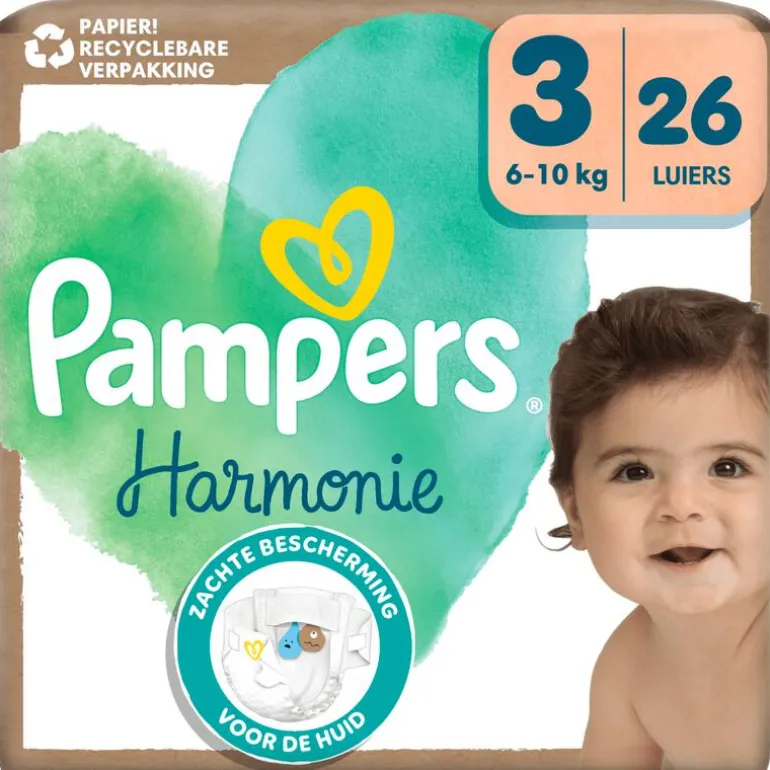 Je baby heeft behoefte aan eenvoudige dingen, zoals liefde en zachtheid. Pampers Harmonie luiers zijn ontworpen om hun gevoelige huid te beschermen met alleen de zorgvuldig geselecteerde materialen die ze nodig heeft. Ze zijn hypoallergeen*, bevatten 0% parfum en lotion, zijn goedgekeurd door dermatologen van de Skin Health Alliance** en Standard 100 gecertificeerd door OEKO-TEX. Ze garanderen een beschermde en droge huid tot 12 uur lang voor de kwaliteitsgarantie die elke ouder nodig heeft. Nu met een Stop & Protect pocket die lekken aan de achterkant van de luier helpt voorkomen. Hun absorberende kern is gemaakt met cellulose van verantwoord beheerde FSC™-gecertificeerde bossen en andere gecontroleerde bronnen. Pampers Harmonie luiers hebben schattige prints en een handige Pampers urine-indicator: jij en je baby zullen er dol op zijn! Wil je weten wat de bestanddelen zijn van Pampers producten? Bezoek pampers.nl.