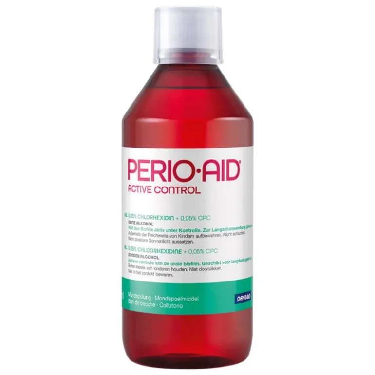 Perio.Aid Mondspoeling Active Control 0,05% is zeer geschikt voor de langdurige ondersteuning van de mondhygiëne bij tandvleesaandoeningen of tijdens en na tandheelkundige ingrepen, zoals implantaten. Perio.Aid Active Control bevat 0,05% Chloorhexidine dat antibacterieel werkt en ontstekingen in de mond helpt te bestrijden en te voorkomen. Perio.Aid wordt ook gebruikt als poetsen niet goed mogelijk is. Perio.Aid is aangenaam van smaak en bevat geen alcohol. Met Chloorhexidine en CPC (Cetylpyridinium Chloride).