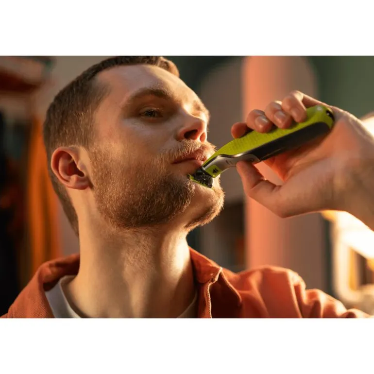 Trim, scheer en style moeiteloos haar van elke lengte met Philips OneBlade. De 360 Blade beweegt in alle richtingen en volgt de contouren van je gezicht, waardoor je makkelijk de moeilijkste gebieden bereikt met minder bewegingen*. De 360 Blade met dubbel beschermingssysteem (gladde coating en afgeronde uiteinden) beweegt 12000x per minuut, voor een effectieve en comfortabele trim- of scheerbeurt. De OneBlade-mesjes zijn ontworpen voor langdurig gebruik, elk mesje gaat tot 4 maanden mee*.