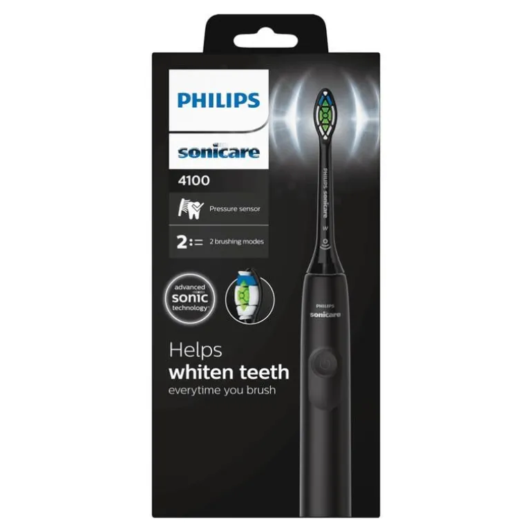 Wittere, gezondere glimlach: de Philips Sonicare 4100 elektrische tandenborstel voor volwassenen maakt uw tanden witter elke keer dat u poetst en wordt geleverd met onze W2 Optimal White-opzetborstel