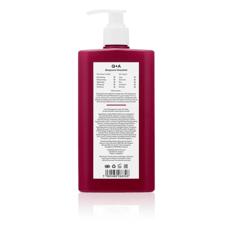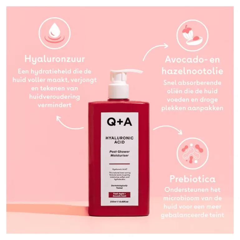 De Q+A Hyaluronic Acid Moisturiser voor na het douchen is ontworpen om aan te brengen op een natte huid en is jouw unieke “ik heb haast”-oplossing voor ultieme hydratatie van de huid. Een mix van diep voedende avocado- en hazelnootolie, plus hyaluronzuur en prebiotica werken harmonieus samen om de huid te hydrateren en aan te vullen.