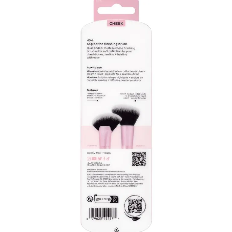 De Angled Fan Finishing Brush is een dubbelzijdige, multifunctionele kwast die met gemak zachte definitie toevoegt aan je jukbeenderen, kaaklijn en haarlijn. Zijde 1 heeft een schuin afgesneden, precieze kop die moeiteloos crème- en vloeibare producten blendt voor een naadloze finish. Zijde 2 is een luchtige, waaiervormige borstel die poederproducten subtiel aanbrengt, opbouwt en vervaagt – perfect voor het highlighten en contouren. De ultra-zachte, dicht op elkaar geplaatste haren zorgen voor maximale opname en egale verdeling van het product. De speciaal gevormde, dubbelzijdige koppen zijn ontworpen om vloeibare, crème- én poederformules nauwkeurig te kunnen aanbrengen. Zoals alle Real Techniques-tools is deze kwast 100% vegan en dierproefvrij.