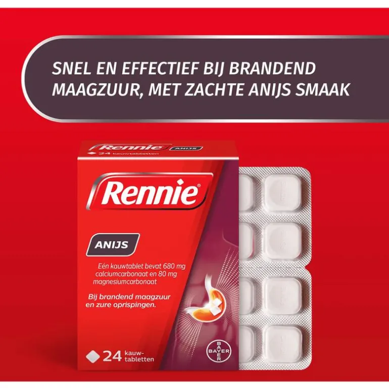 Vettig eten, pittig eten en alcohol zijn bekende triggers van brandend maagzuur, maar soms word je alsnog overvallen door dat branderige gevoel in je slokdarm. Rennie verlicht brandend maagzuur en zure oprispingen gelukkig binnen 2 minuten. Je maag is snel weer rustig zodat je weer van je dag of avond kunt genieten. Rennie is een maagzuurtablet en staat bekend als een maagzuurbinder. Dat betekent dat het overtollig maagzuur in je maag omzet in water en andere lichaamseigen stoffen. Dat gebeurt al binnen 2 minuten na inname. Zodra je last hebt van reflux, kun je 1 tot 2 kauwtabletten innemen, waardoor de klachten snel en voor enkele uren af zullen nemen.Rennie is geschikt voor volwassenen en kinderen vanaf 12 jaar, maar kan ook door zwangere vrouwen gebruikt worden. Als je zwanger bent, raadpleeg dan wel je verloskundje of (huis)arts. Heb je last van winderigheid, probeer dan eens Rennie Deflatine. Voor een dubbele werking is er Rennie Duo, die brandend maagzuur neutraliseert maar ook een beschermend laagje om de maaginhoud legt. Daardoor is de kans kleiner dat brandend maagzuur opnieuw in de slokdarm terecht komt.