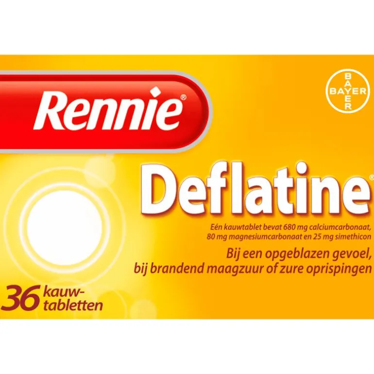 Rennie Deflatine bevat de werkzame stof simethicon, dat kleine gasbelletjes uit elkaar laat vallen in je maag en darmen. Hierdoor gaat het flatulentie tegen en neemt het gevoel van een opgeblazen buik af. Daarbovenop verlicht Rennie Deflatine ook brandend maagzuur binnen 2 minuten. Je maag is snel weer rustig zodat je weer van je dag of avond kunt genieten. Rennie is een maagzuurtablet en staat bekend als een maagzuurbinder. Dat betekent dat het overtollig maagzuur in je maag omzet in water en andere lichaamseigen stoffen. Zodra je last hebt van brandend maagzuur, eventueel samen met een opgeblazen buik of flatulentie, kun je 1 tot 2 kauwtabletten innemen.Rennie Deflatine is geschikt voor volwassenen en kinderen vanaf 12 jaar, maar kan ook door zwangere vrouwen gebruikt worden. Als je zwanger bent, raadpleeg dan wel je verloskundje of (huis)arts. Heb je geen last van winderigheid of een opgeblazen gevoel, dan kun je ook een gewone Rennie proberen, zoals de Suikervrije variant. Voor een dubbele werking is er Rennie Duo, die brandend maagzuur neutraliseert maar ook een beschermend laagje om de maaginhoud legt. Daardoor is de kans kleiner dat brandend maagzuur opnieuw in de slokdarm terecht komt.