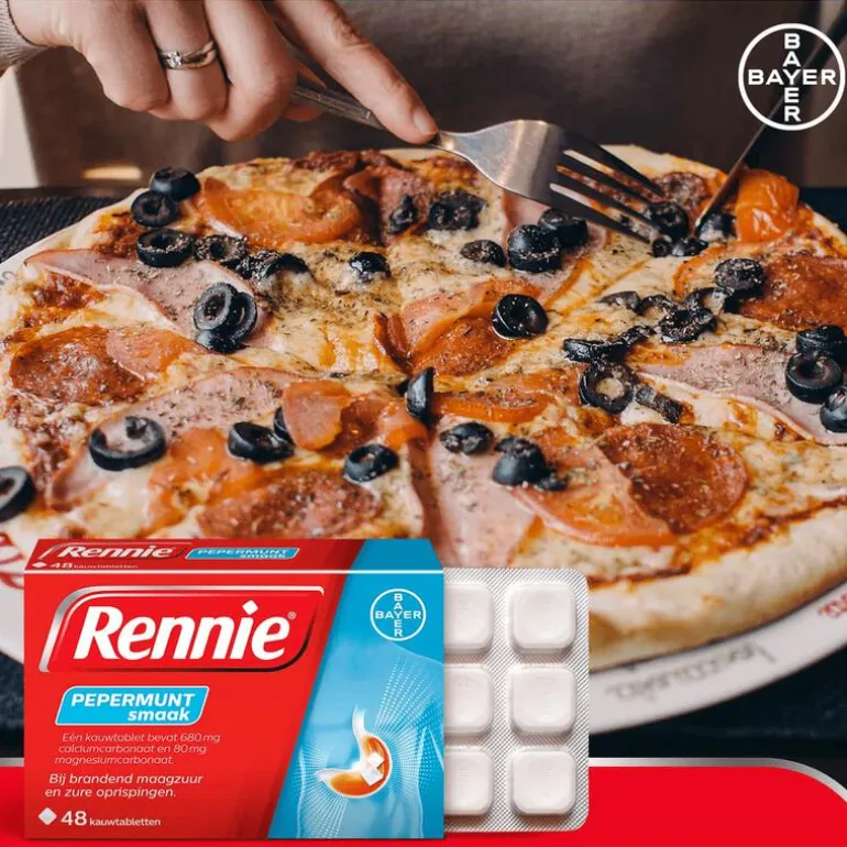 Vettig eten, pittig eten en alcohol zijn bekende triggers van brandend maagzuur, maar soms word je alsnog overvallen door dat branderige gevoel in je slokdarm. Rennie verlicht brandend maagzuur en zure oprispingen gelukkig binnen 2 minuten. Je maag is snel weer rustig zodat je weer van je dag of avond kunt genieten. Rennie is een maagzuurtablet en staat bekend als een maagzuurbinder. Dat betekent dat het overtollig maagzuur in je maag omzet in water en andere lichaamseigen stoffen. Dat gebeurt al binnen 2 minuten na inname. Zodra je last hebt van reflux, kun je 1 tot 2 kauwtabletten innemen, waardoor de klachten snel en voor enkele uren af zullen nemen.Rennie is geschikt voor volwassenen en kinderen vanaf 12 jaar, maar kan ook door zwangere vrouwen gebruikt worden. Als je zwanger bent, raadpleeg dan wel je verloskundje of (huis)arts. Heb je last van winderigheid, probeer dan eens Rennie Deflatine. Voor een dubbele werking is er Rennie Duo, die brandend maagzuur neutraliseert maar ook een beschermend laagje om de maaginhoud legt. Daardoor is de kans kleiner dat brandend maagzuur opnieuw in de slokdarm terecht komt.