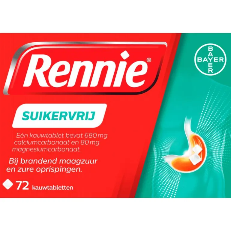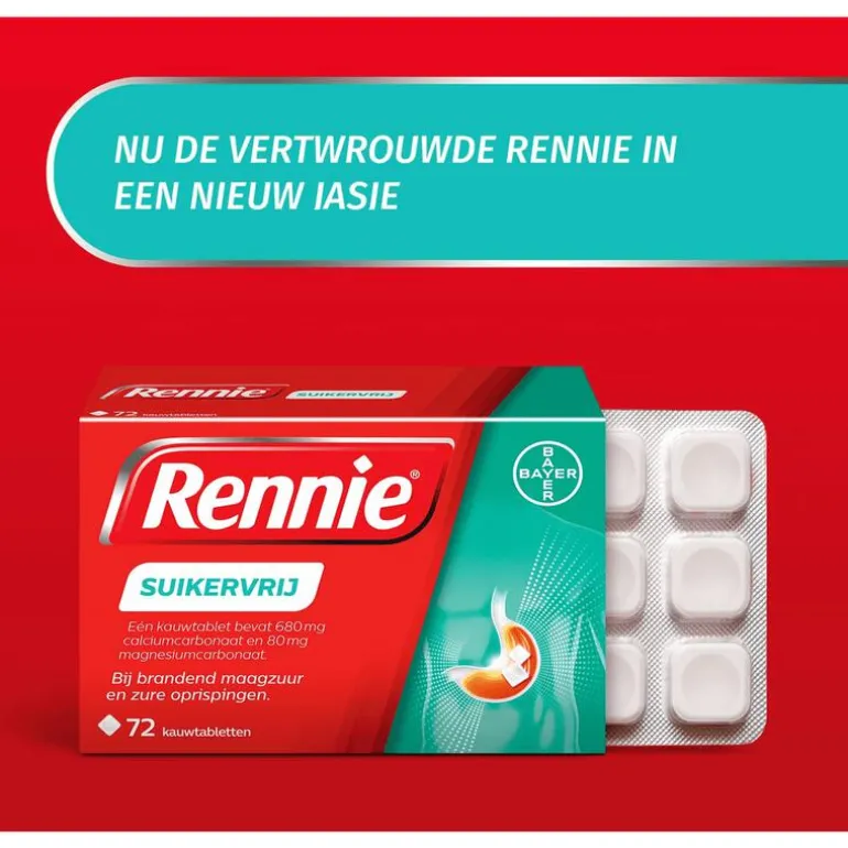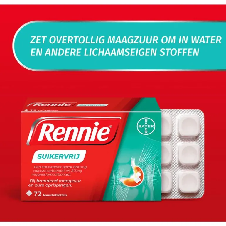 Vettig eten, pittig eten en alcohol zijn bekende triggers van brandend maagzuur, maar soms word je alsnog overvallen door dat branderige gevoel in je slokdarm. Rennie verlicht brandend maagzuur en zure oprispingen gelukkig binnen 2 minuten. Je maag is snel weer rustig zodat je weer van je dag of avond kunt genieten. Rennie is een maagzuurtablet en staat bekend als een maagzuurbinder. Dat betekent dat het overtollig maagzuur in je maag omzet in water en andere lichaamseigen stoffen. Dat gebeurt al binnen 2 minuten na inname. Zodra je last hebt van reflux, kun je 1 tot 2 kauwtabletten innemen, waardoor de klachten snel en voor enkele uren af zullen nemen.Rennie is geschikt voor volwassenen en kinderen vanaf 12 jaar, maar kan ook door zwangere vrouwen gebruikt worden. Als je zwanger bent, raadpleeg dan wel je verloskundje of (huis)arts. Heb je last van winderigheid, probeer dan eens Rennie Deflatine. Voor een dubbele werking is er Rennie Duo, die brandend maagzuur neutraliseert maar ook een beschermend laagje om de maaginhoud legt. Daardoor is de kans kleiner dat brandend maagzuur opnieuw in de slokdarm terecht komt.