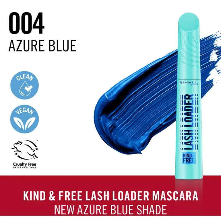 Rimmel Kind & Free Lash Loader Mascara, nu in het azuurblauw. De Rimmel Kind & Free Lash Loader Mascara zorgt voor 300% meer volume in vergelijking met onopgemaakte wimpers en is bovendien geschikt voor gevoelige ogen.