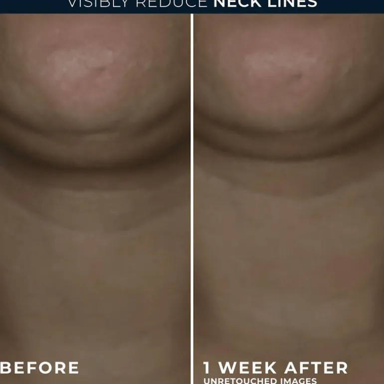Na 1 week zijn horizontale lijntjes in de hals zichtbaar met 49% verminderd en heeft 97% een zichtbaar stevigere huid op gezicht en hals*. Deze niet-invasieve crème bevat hyaluronzuur om de huid zichtbaar voller te maken, terwijl retinol en swertiamarin de huid zichtbaar verstevigen en herstructureren.