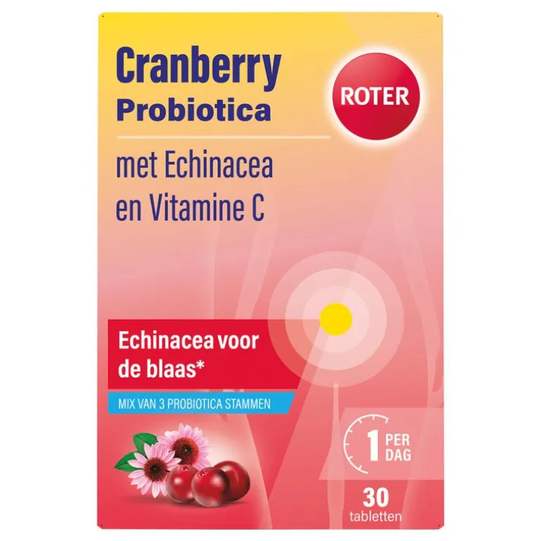 Roter Cranberry + Probiotica is een voedingssupplement speciaal ontwikkeld met Echinacea om een gezond milieu in de blaas te ondersteunen1 aangevuld met natuurlijke plantenextracten, vitamine C en bacterie- en gistsoorten.