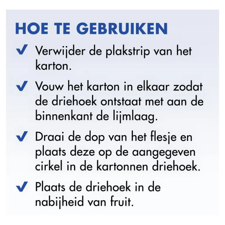 Gebruiksaanwijzing: 1. Verwijder de plakstrip van het karton 2. Vouw het karton in elkaar zodat de driehoek ontstaat met aan de binnenkant een lijmlaag 3. Draai de dop van het flesje 4. Plaats het flesje vervolgens op de aangegeven cirkel in de kartonnen driehoek 5. Plaats de driehoek in de nabijheid van fruit.