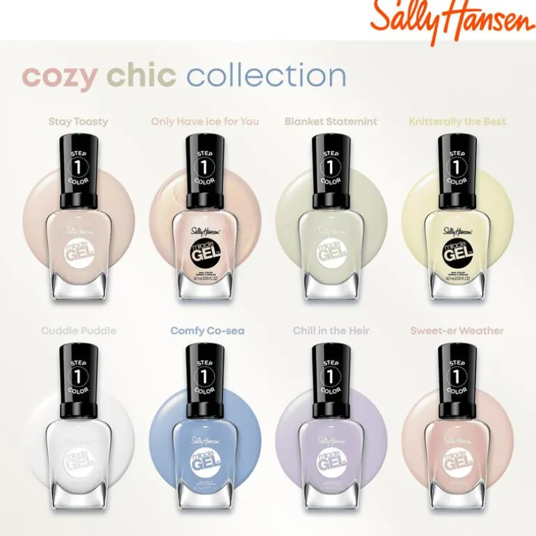Geïnspireerd door kabeltruien, romige koffie, warme chocolademelk en alles daartussenin, krijg deze herfst dat warme en knusse gevoel met onze NIEUWE Miracle Gel® Cozy Chic Collectie. Dit assortiment van 8 crèmekleuren zal zelfs de meest neutrale outfits aanvullen, of je nu lekker warm binnen zit of warm blijft met een kopje koffie bij de open haard. Combineer je favoriete Cozy Chic tint met Miracle Gel™ Top coat voor een chipbestendige manicure die het hele seizoen meegaat. *Tot 8 dagen kleur en glans