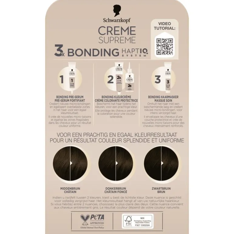 Meer dan 120 jaar geleden legde de Duitse chemicus en apotheker Hans Schwarzkopf de basis voor een merk dat sindsdien altijd voorop heeft gelopen op het gebied van innovatie. De combinatie van kwaliteitsingrediënten en de nieuwste haarverzorgingstechnologie, betrouwbaarheid, expertise en vakmanschap zijn de hoekstenen van alles wat het merk doet en waar het voor staat. Creme Supreme is de meest verzorgende permanente haarkleuring van Schwarzkopf, met het 3x Bonding HAPTIQ System dat het haar beschermt bij elke stap : voor, tijdens en na het kleuren.