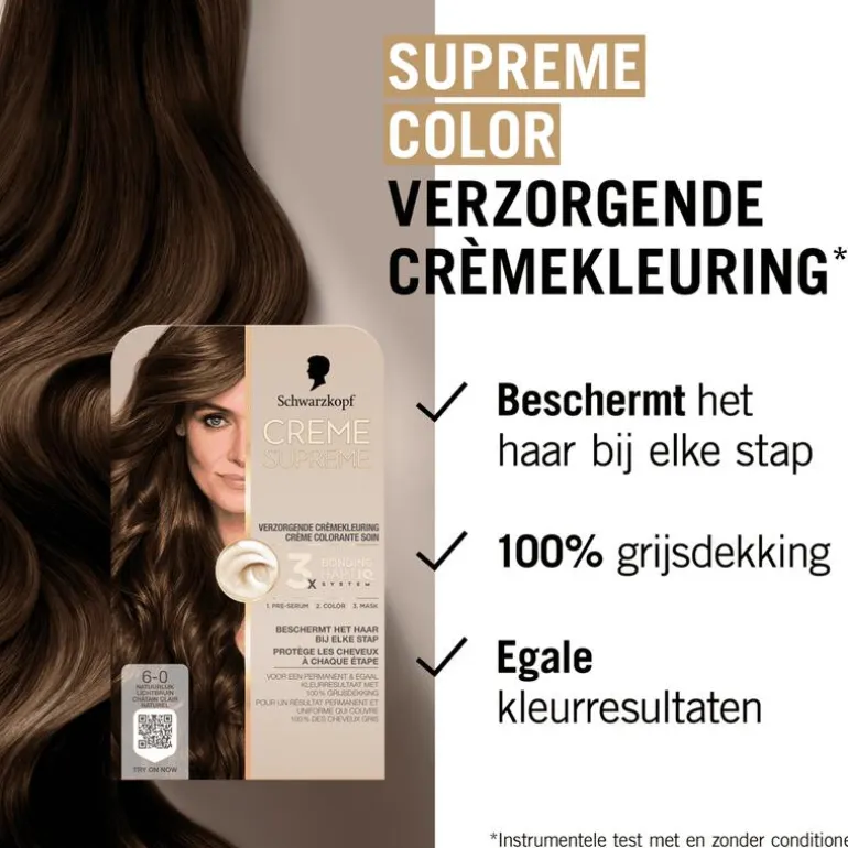 Meer dan 120 jaar geleden legde de Duitse chemicus en apotheker Hans Schwarzkopf de basis voor een merk dat sindsdien altijd voorop heeft gelopen op het gebied van innovatie. De combinatie van kwaliteitsingrediënten en de nieuwste haarverzorgingstechnologie, betrouwbaarheid, expertise en vakmanschap zijn de hoekstenen van alles wat het merk doet en waar het voor staat. Creme Supreme is de meest verzorgende permanente haarkleuring van Schwarzkopf, met het 3x Bonding HAPTIQ System dat het haar beschermt bij elke stap : voor, tijdens en na het kleuren.