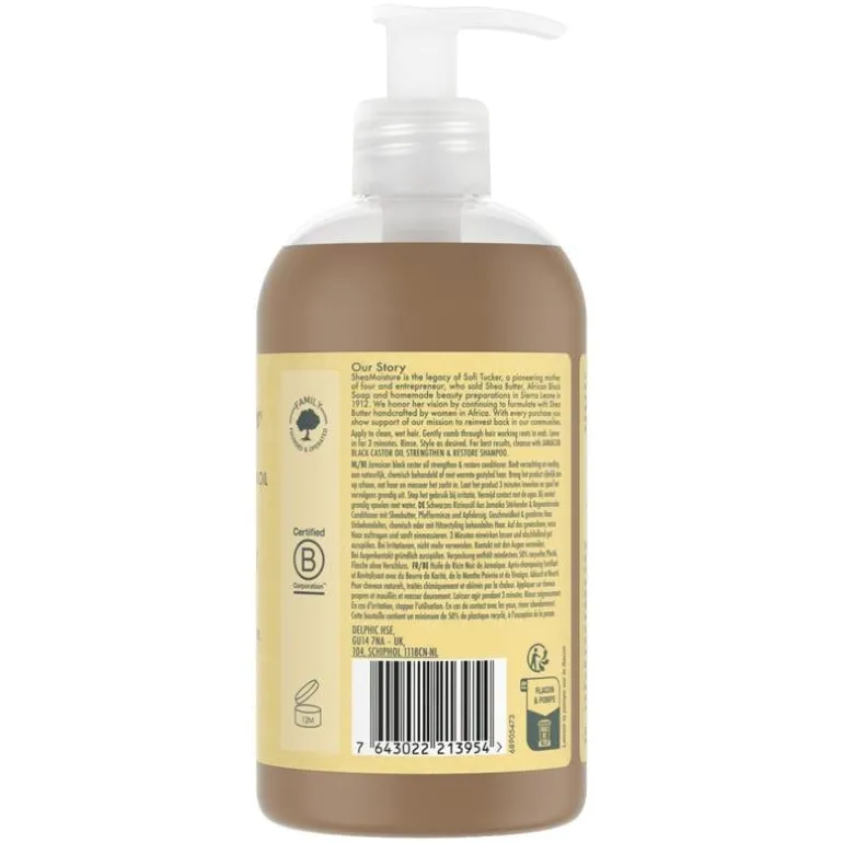 SheaMoisture Jamaican Black Castor Oil Strengthen & Restore Conditioner verzacht en ontwart het haar terwijl het pluizig haar onder controle houdt. Perfect voor hen die regelmatig hun haar kleuren, steil maken, permanenten, of met warmte stylen, maar ook voor natuurlijke stijlen. Een versterkende conditioner die het haar ontwart en herstelt, zonder het haar te verzwaren. Geformuleerd met Jamaicaanse zwarte castorolie en fair trade sheaboter uit Ghana. Het voedt en versterkt beschadigd, broos haar, waardoor de kans op haarbreuk wordt verminderd. De pepermuntolie helpt de hoofdhuid te stimuleren voor een verkwikkende ervaring. De conditioner maakt het haar glanzend en geeft een beschermende laag die gespleten haarpunten verbetert. Hoe te gebruiken: Voor het beste resultaat reinig je je haar eerst met SheaMoisture Jamaican Black Castor Oil Strengthen & Restore Shampoo. Breng vervolgens de conditioner rijkelijk aan op nat haar en masseer het zachtjes in. Laat het product 3 minuten inwerken en spoel het grondig uit, maar vermijd contact met de ogen. Bij contact met de ogen direct uitspoelen met water. Het verhaal van SheaMoisture: SheaMoisture is de erfenis van Sofi Tucker, een pionierende ondernemer en moeder van vier kinderen. Al in 1912 verkocht zij zelfgemaakte schoonheidsproducten, zoals Shea Butter en African Black Soap, in Sierra Leone. We eren haar visie door gebruik te blijven maken van pure sheaboter, handgemaakt door vrouwen in Afrika. Door het kopen van onze producten help je deze vrouwen om een betere, gezondere toekomst te realiseren. Onze producten zijn vier generaties lang getest op de Tucker-familie, maar nooit op dieren.