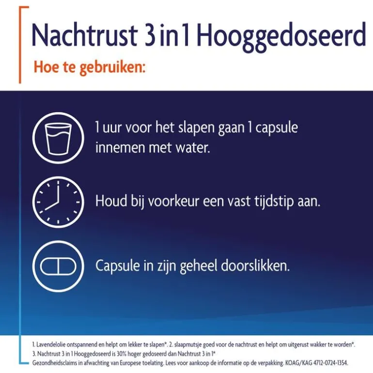 1 uur voor het slapen gaan 1 capsule innemen. Capsule in zijn geheel doorslikken met bijvoorbeeld water. Houd bij voorkeur een vast tijdstip aan.