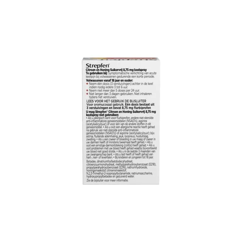 Overgevoeligheid voor NSAID’s, maag-/darmzweer, hart-,nier- of leverfalen, bloedstollings- of bloedingsproblemen. Laatste 3 mnd zwangerschap. Kinderen jonger dan 18 jaar.,Indicatie: Het verlichten van keelklachten zoals keelpijn en zwelling.