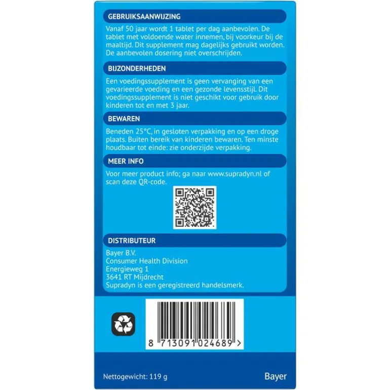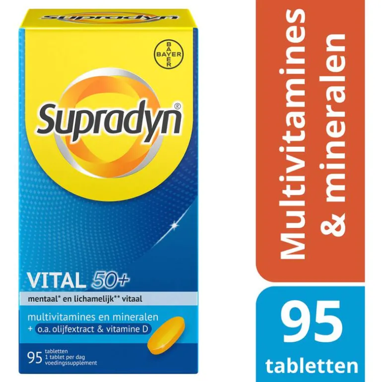 Supradyn Vital 50+ bevat een combinatie van vitamines die voorzien in de veranderende behoefte van je lichaam vanaf 50 jaar. De vitamines B1, B2, B3, B5, B6, B8, B12, C, het mineraal magnesium en het sporenelement ijzer ondersteunen je energieniveau en houden je vitaal. De mineralen ijzer, jodium en zink zijn goed voor het geheugen en behoud van een heldere geest. ; Essentiële vitamines en mineralen spelen een belangrijke rol bij de energiestofwisseling. Supradyn Vital 50+ ondersteunt je energieniveau* en helpt je om geestelijk** en lichamelijk* vitaal te blijven. *De vitamines B1, B2, B3, B5, B6, B8, B12, C, het mineraal magnesium en het sporenelement ijzer ondersteunen je energieniveau en houden je vitaal zodat je de dingen kunt blijven doen die je graag doet. ; **De mineralen ijzer, jodium en zink zijn goed voor het geheugen en behoud van een heldere geest.